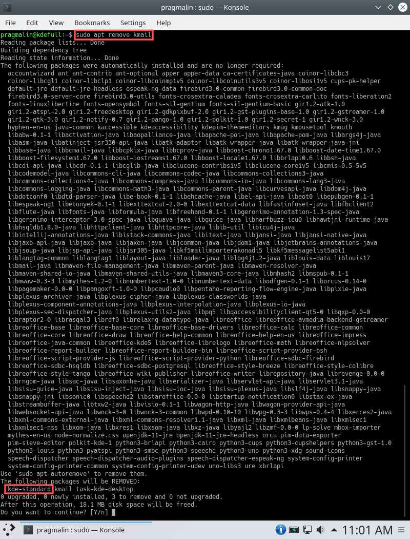 After installing Debian with KDE and logging in for the first time, I noticed a lot of extra desktop applications that I have no need for. Take Kmail for example. I expect that Kmail is a great e-mail client, but I personally prefer Thunderbird. No big deal, right? Just remove Kmail and install Thunderbird. Wrong! Look what happens when you attempt to remove Kmail: